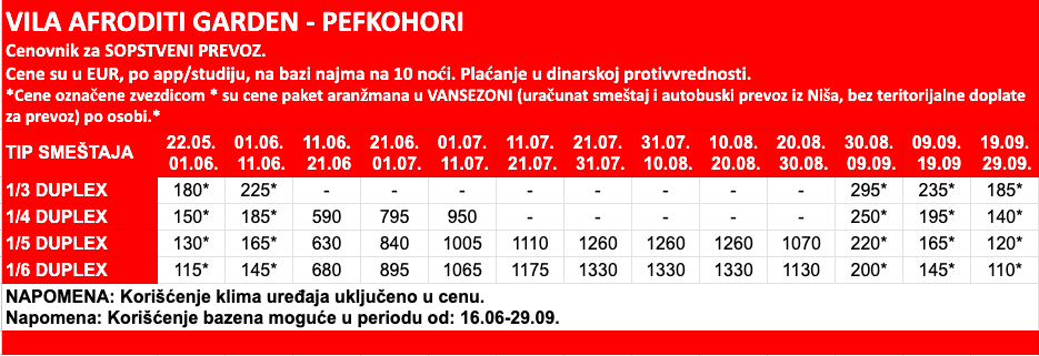 Sve cene u tabelama date su u eurima, a plative su isključivo u dinarskoj protivvrednosti po srednjem kursu Narodne banke Srbije na dan uplate. Cena aranžmana garantovana je samo za uplaćeni deo ukupne sume, ostatak je podložan promeni u slučaju oscilacije kursa ili inflacije.