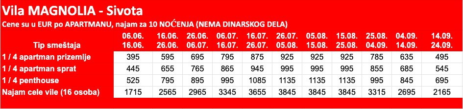 Cenovnik za Leto 2026 – SOPSTVENI PREVOZ – PO SOBI