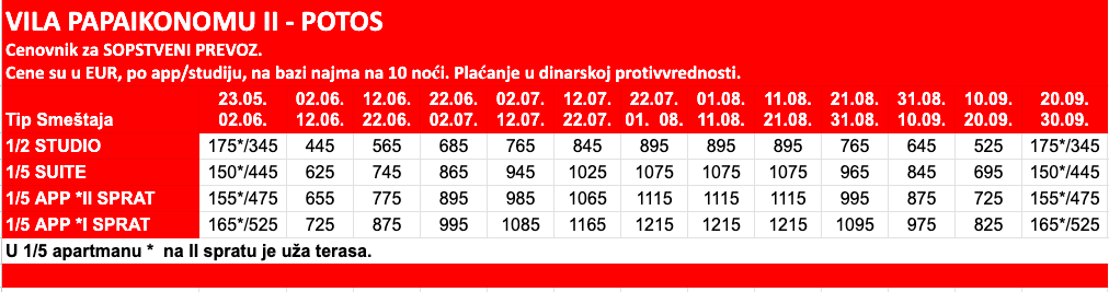 Cenovnik za Leto 2026 – SOPSTVENI PREVOZ – 10 NOĆI